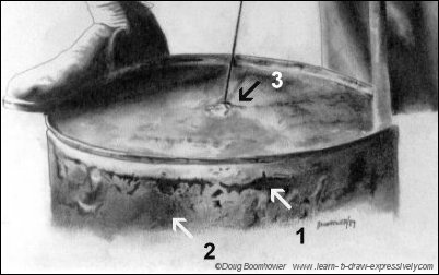 The top of the barrel is not as rough as the sides. I have softened it with brushes. Notice the variety of lights and darks across the whole top surface. Many of the dented areas have been created by actually tapping blending stumps on the paper. (I've mentioned in my texture introduction that you should try to think "tactile"...how much more tactile can you get than actually tapping the paper?)
